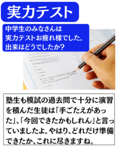 まったく苦手な分野でも教科書レベルの内容から学習し、練習問題で訓練して、模試の過去問で実戦力を養うと実力テストの問題といえどもできるようになってくるんです。